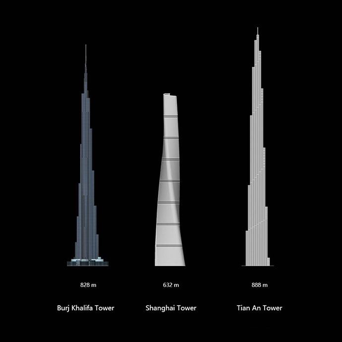 天安塔的造型像春笋一样螺旋向上,寓意事物的螺旋式发展和螺旋式上升。大楼高度为888米,超过828米的世界最高大楼迪拜塔。大楼基于模块化参数设计,建造效率和安全性都有了显著提升。